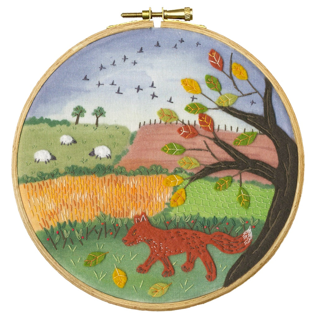 Falling Leaves - Fox is felt embroidered. Fox with pastures and sheep in the background. Piece uses a variety of stitches and felt pieces Original Artwork by Bothy Threads