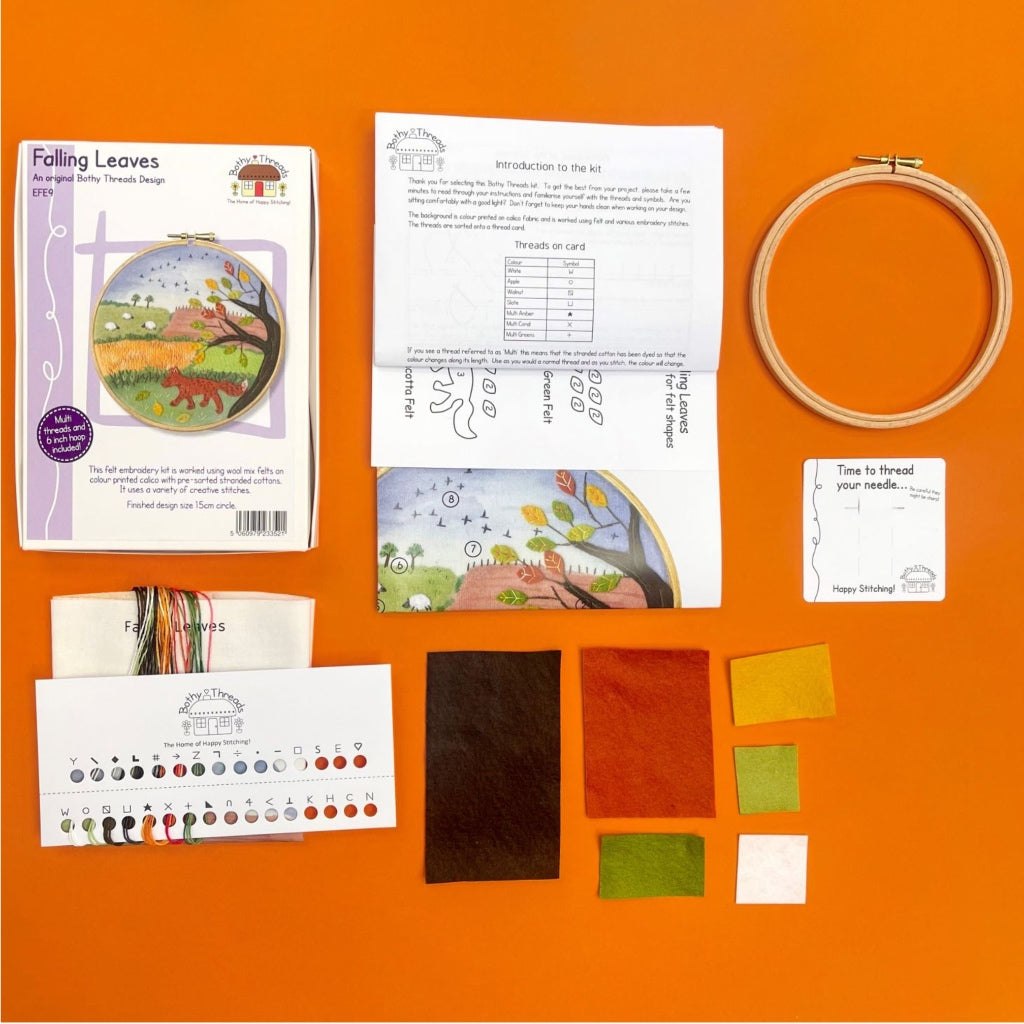 This kit contains: Color-printed design with wool felt pieces and backing calico with pre-sorted stranded cottons, needle, instructions, and embroidery hoop.