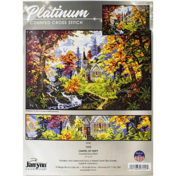 Contains 14 count white Aida Fabric, 6 strand cotton floss, needle, chart and instructions..