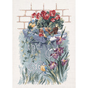 Permin 70-4398 stitchery kit: Blue Titmouse and Garden flowers Delightful garden scene of Blue Titmouse sitting beside a potted flowering plant with irises growing in the foreground 28 ct Permin Linen - ecru