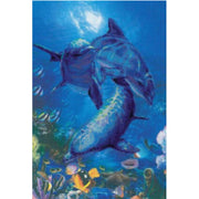 Riolis Dolphins. Swimming in coral like scene with fish and other marine sea creatures on preprinted background. Designed by Galina Skabeeva