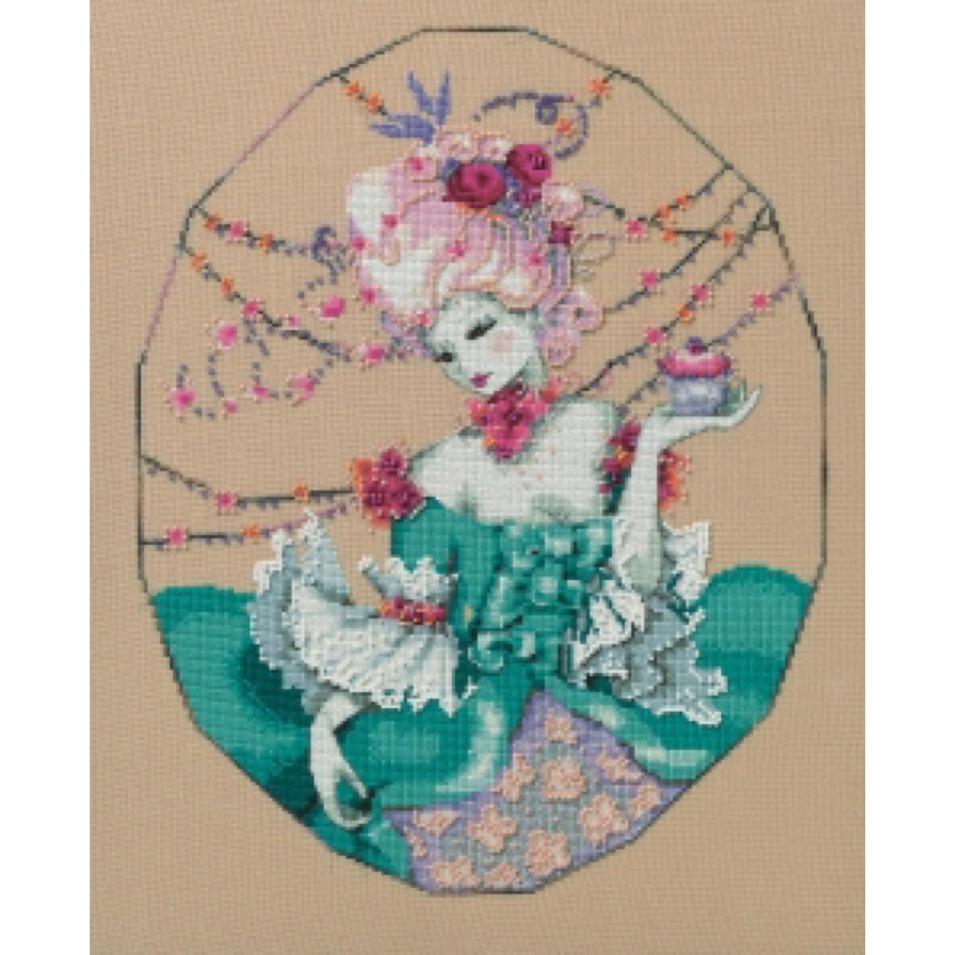 Mirabilila #165 Garden Prelude by Nora Corbett Not all is sweet is good....Painted Victoria lady in teal dress Worked in 32ct or 16ct fabric. Approximate design