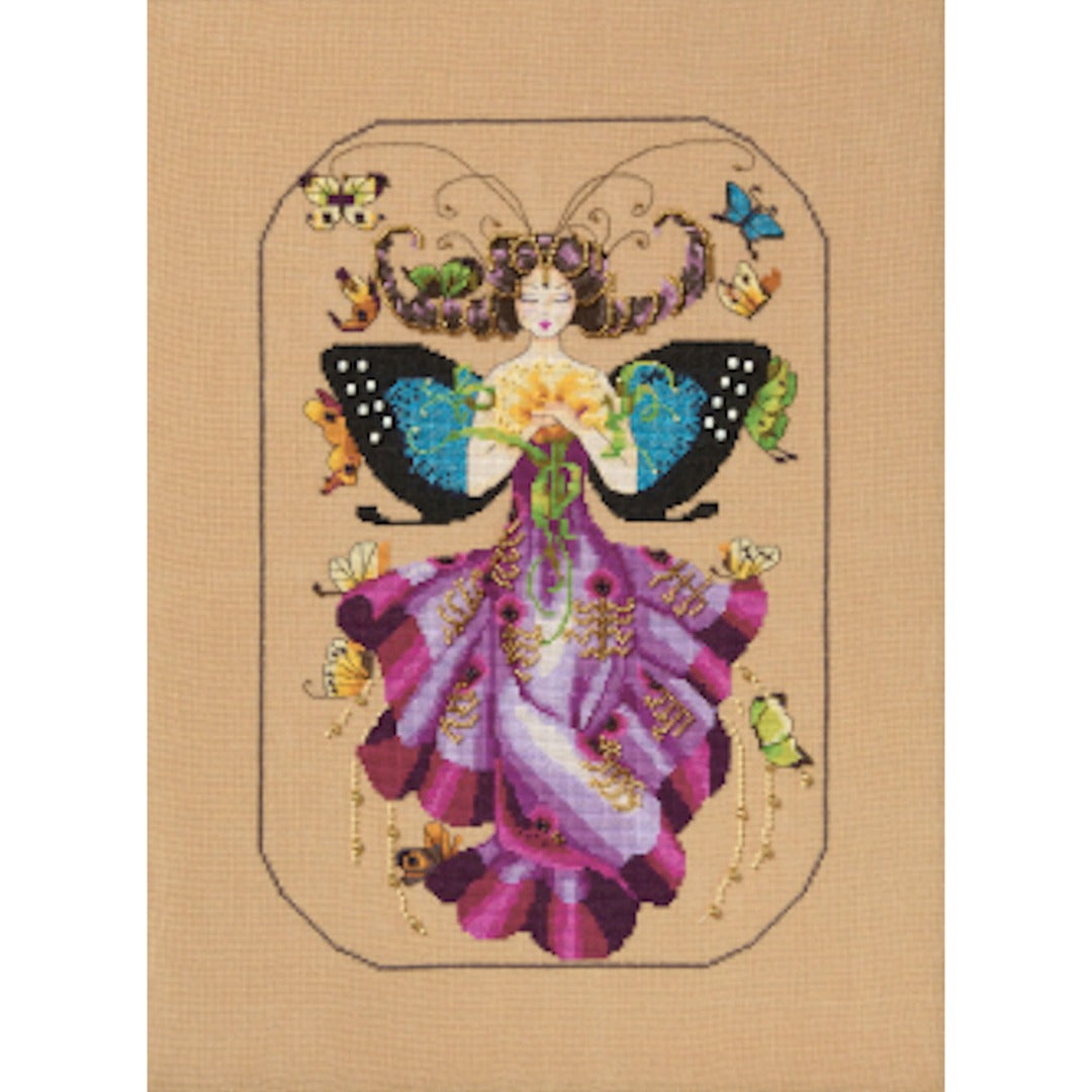 Fairy with blue wings and plum colored flowing dress. Embellished with specialty threads and treasures.