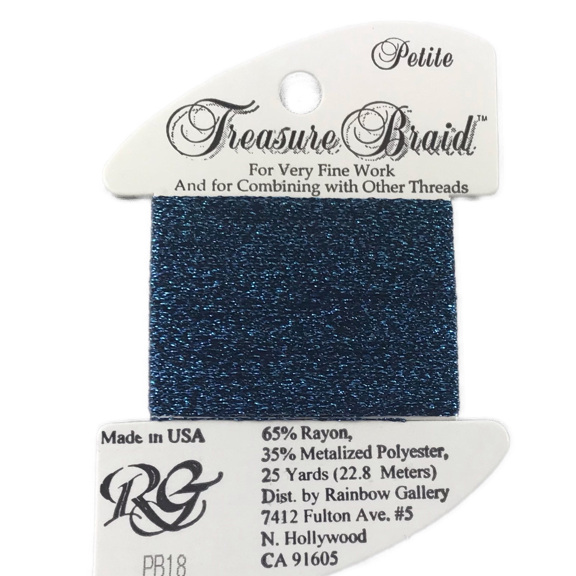 A 3-ply braided metallic, Treasure Braid Petite is for very fine work or to combine with other threads. Light coverage for 18 count but works great for Cross Stitch
