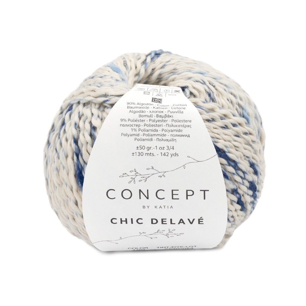 Katia Chic Delave is a wavy yarn consisting of soft cotton singles that contrast with a monochrome bohemian spray print and elegant sparkles.