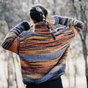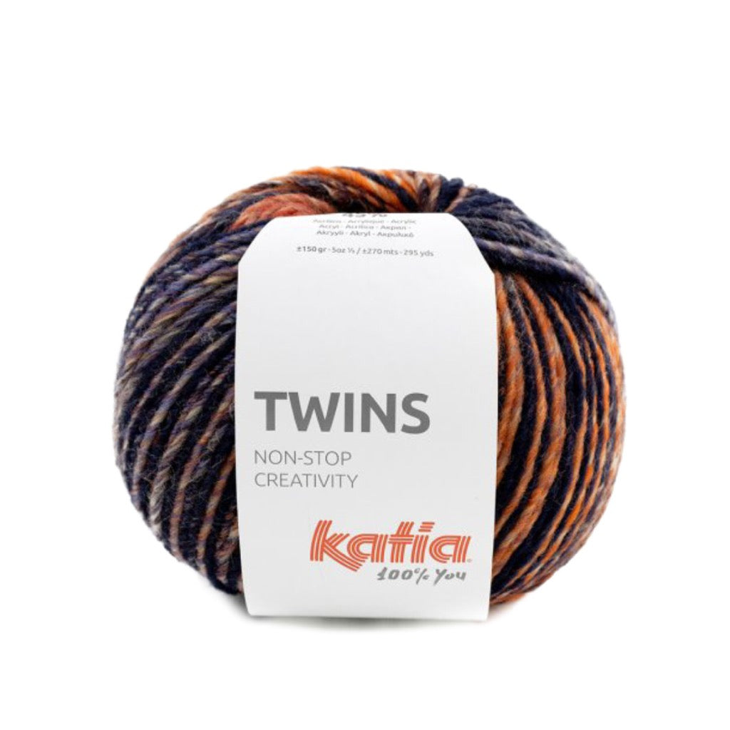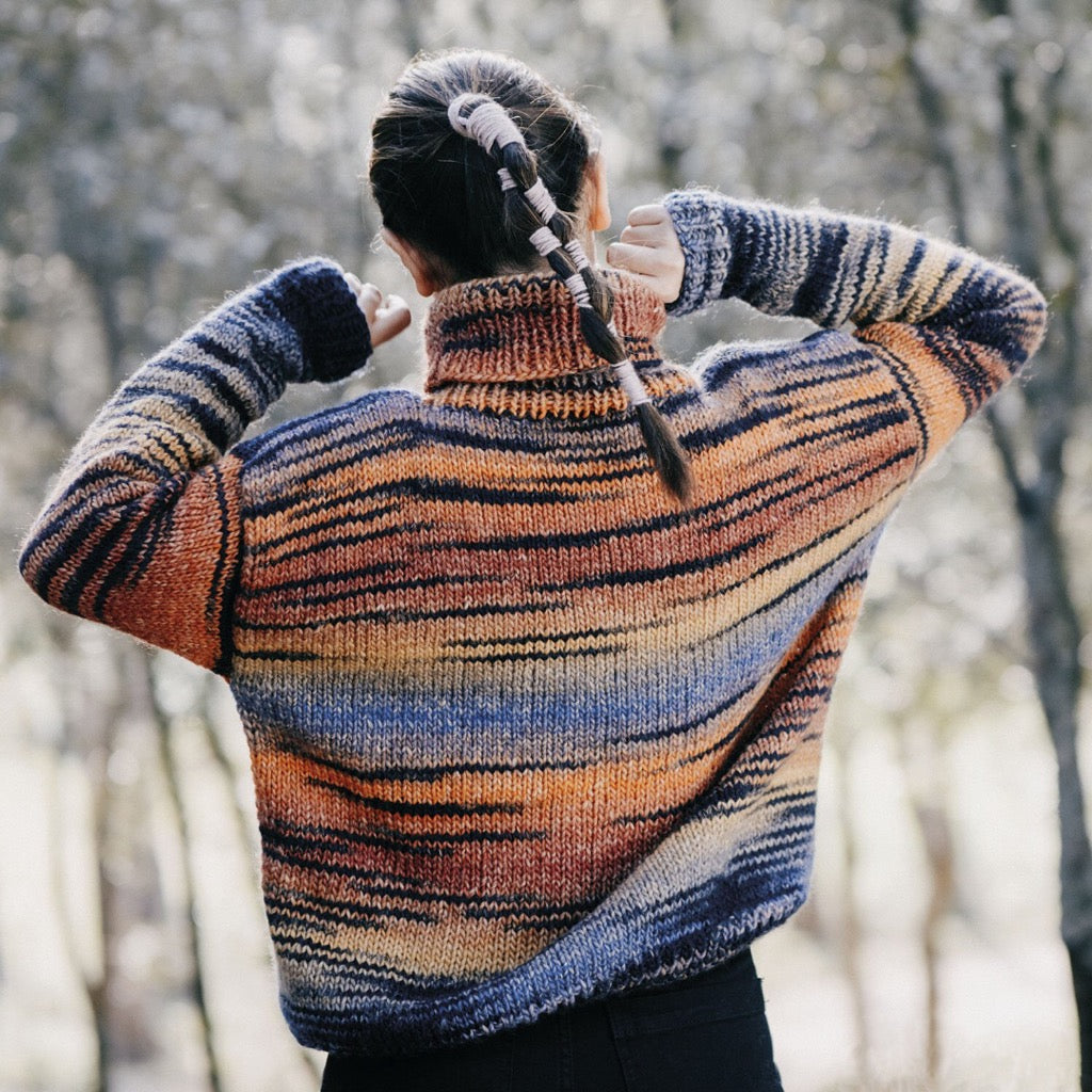 Twins is a surprising fantasy yarn with blurred black stripes over a graded color effect of warm and cool colors.
