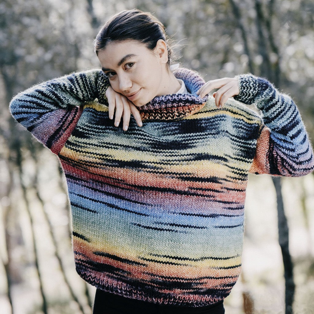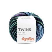 Twins is a surprising fantasy yarn with blurred black stripes over a graded color effect of warm and cool colors.