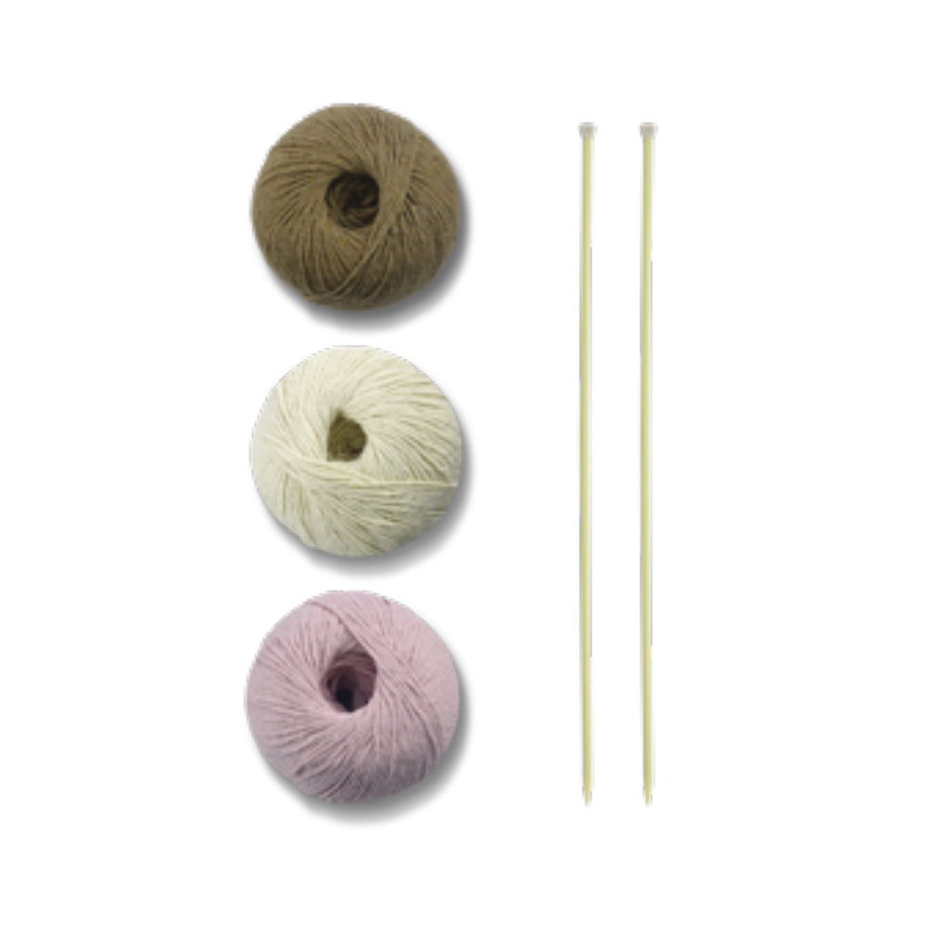 Kit includes: Crochet hook, 1 skein each, Apolo Eco 4/6 20 (Natural), 7466 chestnut, #3526 (Candy Rose) , Knitting Needles