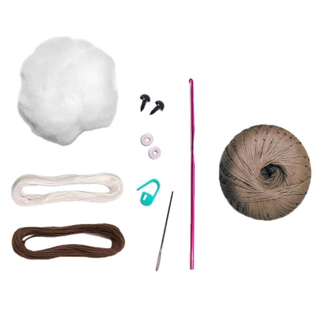 Kit includes: Crochet hook, 1 balls of Amigurumi yarn #7625, 2 skeins 7569, 1 skein 8176, Amigurumi skein, safety eyes, stuffing, crchet hook1 stitch marker, and tapestry needle, locking stitch marker.