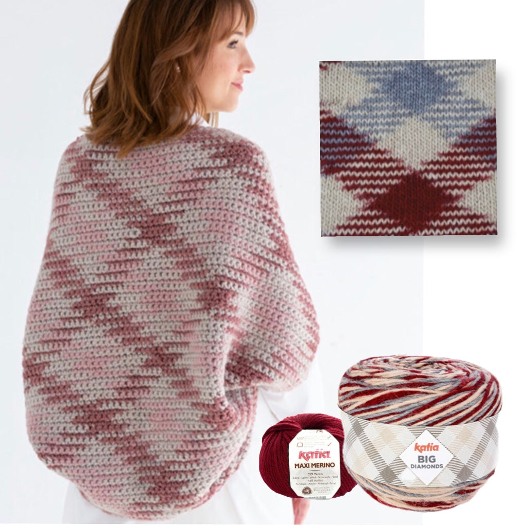 Crochet Poncho Big Diamonds , a yarn with planned color changes and add an edging with a solid colour of Maxi Merino yarn.