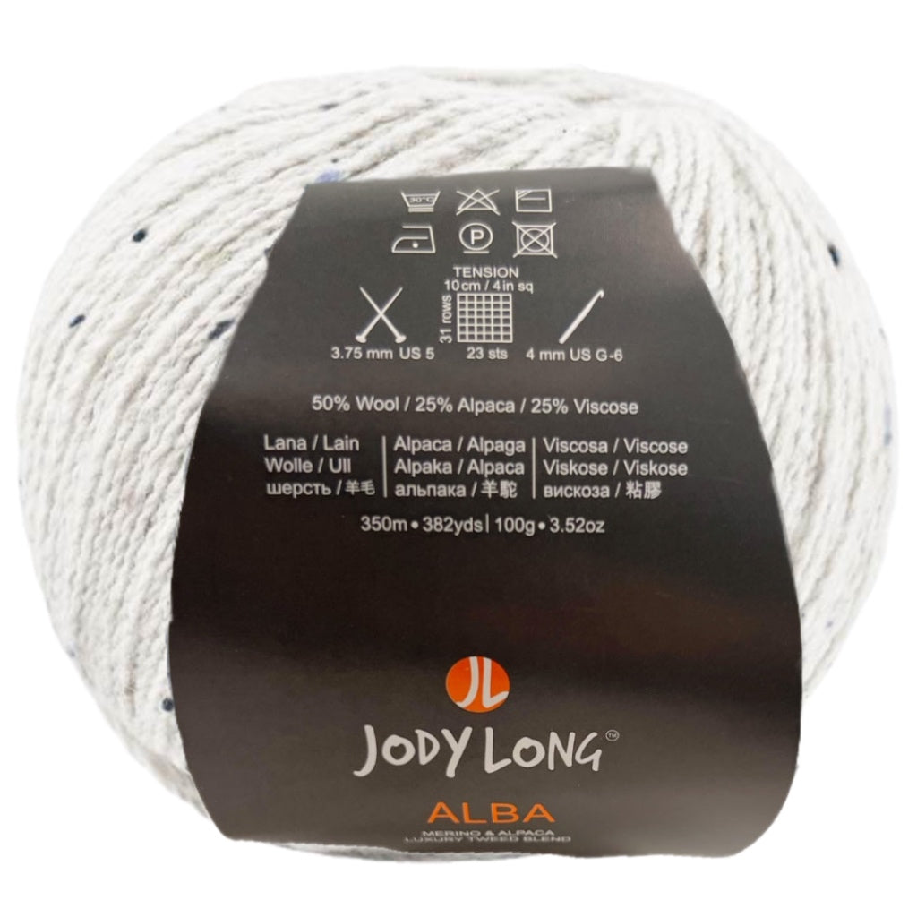 Jody Long Alba This tweedy yarn combines a luxurious blend of Merino Wool and Superfine Alpaca, accented with a taste of viscose sourced from German sustainable forestry.