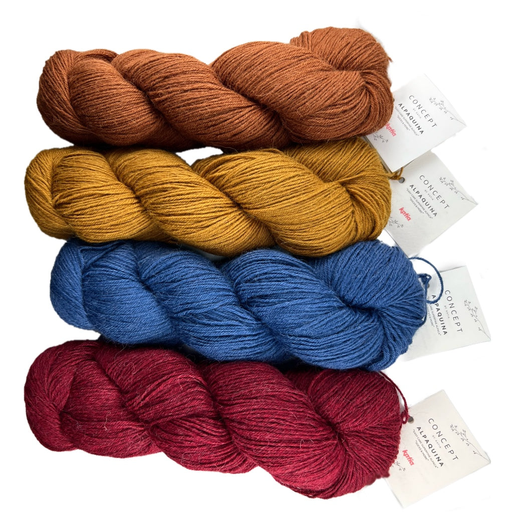 Choose our soft and durable Katia's Alpaquina 319 Brown, 311 Mustard, 36 Violet Blue, 312 Raspberry