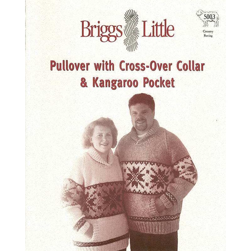 Briggs & Little Country Roving yarn is used to knit this Cowichan kangaroo sweater.. aka White Buffalo or Salish. Features cross-over garter stitch cowl collar with raglan sleeves and kangaroo pockets with a traditional snowflake design.