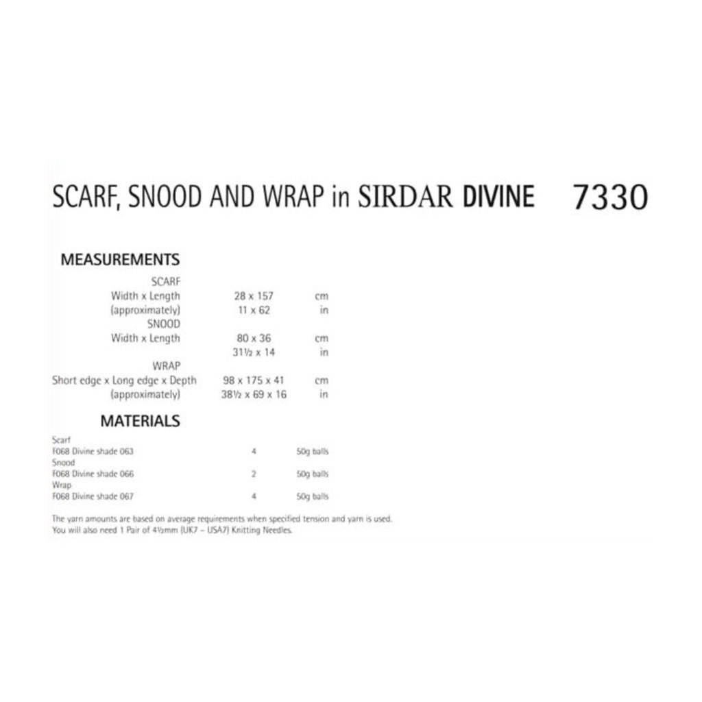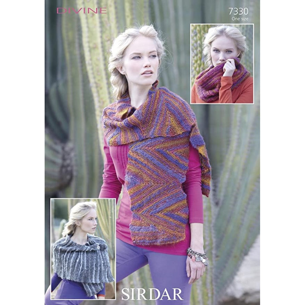 Sirdar 7330 features a Divine scarf with short rowing in a garter stitch pattern. Designed fashionably wide.