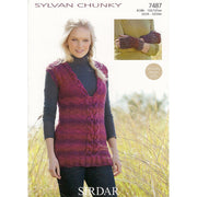 Sirdar 7487 presents Sylvan Chunky vest with full twin cables running in the front and separating at the neckline to join at the back of the neck. This cardigan fits well into todays fashion with Sylvan yarn which is a thick and thin yarn.