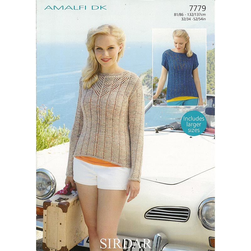 Sirdar - Amalfi DK sweater with lace running length of sweater and full lace neckline. Round neck is border with garter stitch. Design worked in long or short sleeved