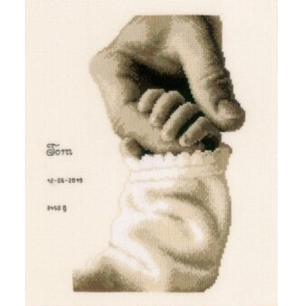 Vervaco features Baby Love Sepia tones of baby hand and adult hand Kit contains: 14 ct Aida, instructions and thread and needle.