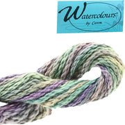 Watercolours by Caron Collection is a 3 ply, hand-dyed 100% pima cotton in stunning variegated colors. It has a silky sheen. Separate the plies and use one or more in the needle.
